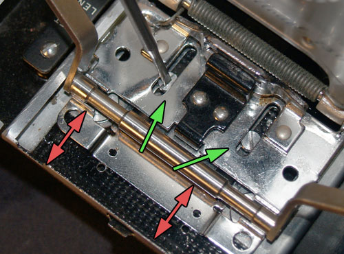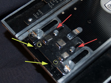 Drill out the rivets, yellow arrows from the bottom. Loosen the 2 adjustment screws, red arrows.