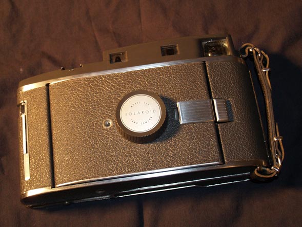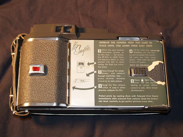Looking at the back, you can see the rangefinder has only 2 windows here. One is the viewfinder, where you compose the pic, the other is the rangefinder where you focus your scene. Its not actually that distracting to use, if anything it makes you more aware of your scene as you have to pause while you focus and then compose. The Model 110B and 900 have coupled view/rangefinders, with only one window for both tasks. The red switch is strictly for the defunct roll-film, makes a cool clicking noise though. The silver tab holds the back port closed, many people taped the procedures for using the camera here.