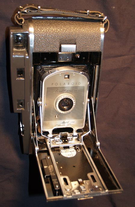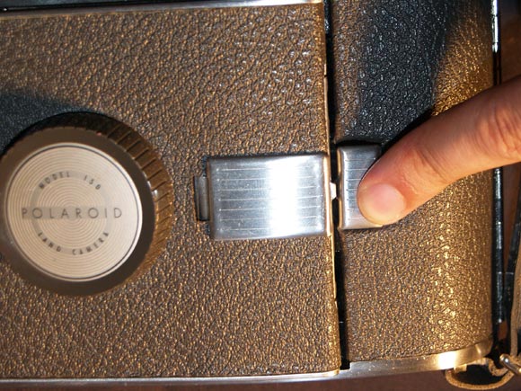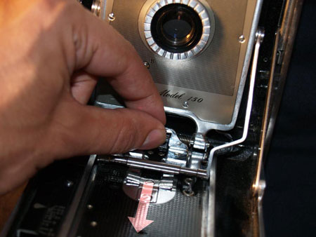 Now, to close the front, might not be as simple as you would think at first glance. Try as you might, it just won't fold back. If you look inside the camera, you'll notice 2 hinged struts that hold the front down. These ride inside a track within the camera body. In the open position they have locked up into the tracks and need to be pushed back down before you can close.