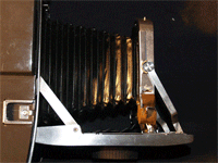 Now to see the bellows in action. There is a black metal tab at the bottom of the lens strut. Pinch it to unlock, and pull it forward as far as it will go. It should click when it reaches the end and not move back or forward anymore. If you grasp the focus knob and give it a turn, you will notice the camera moving back and forth. Also, notice the distance scale on the side of the rails. Later, we will need to "reset" the location of the infinity stop, the place where the black tab locks. Always set the focus to infinity when closing the camera.